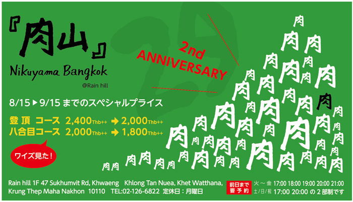 2020.08.11 お得情報 , プロモーション期間終了 【9/15(火)まで】2nd ANNIVERSARY♪プロモーション☆肉山☆ 2周年を迎えた「肉山」が 感謝を込めてお得なプロモーションをご用意 ご予約時に「ワイズを見た」とお伝え下さい♪ こちらのプロモーションは既に終了しています。 その他のプロモーション情報一覧はこちら。 2周年を迎えた「肉山」が 感謝を込めてお得なプロモーションをご用意 ご予約時に「ワイズを見た」とお伝え下さい♪ https://www.facebook.com/Nikuyama.Bangkok この記事をSNSでシェア! Tweet Share LINE リンクをコピー