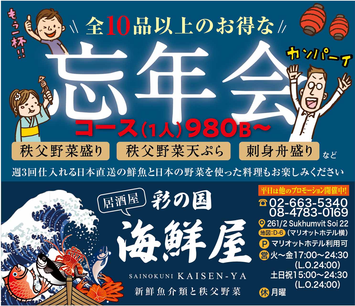 2020.11.26 お得情報 , プロモーション期間終了 【忘年会】980B〜のお得なコース☆海鮮屋☆ 忘年会 海鮮屋 こちらのプロモーションは既に終了しています。 その他のプロモーション情報一覧はこちら。 980B〜/1人 全10品以上のお得なコース! 刺身舟盛り、秩父野菜天ぷらなどでご用意致します。 詳細は 02-663-5340又は、084-783-0169までお問合せ下さい。 この記事をSNSでシェア! Tweet Share LINE リンクをコピー