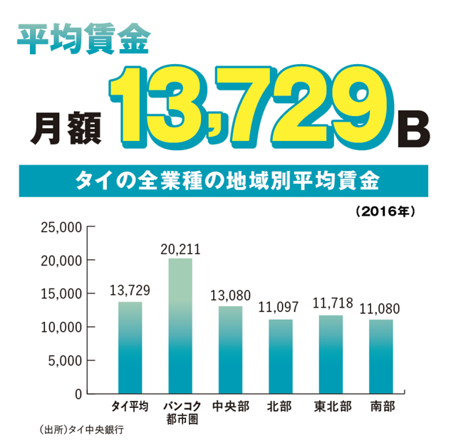 2016年の平均月額賃金(残業手当、ボーナス、福利厚生費を除く)は13,729バーツ。バンコク都市部と一番低い南部とでは、約2分の1と地域格差が明確に表れている。