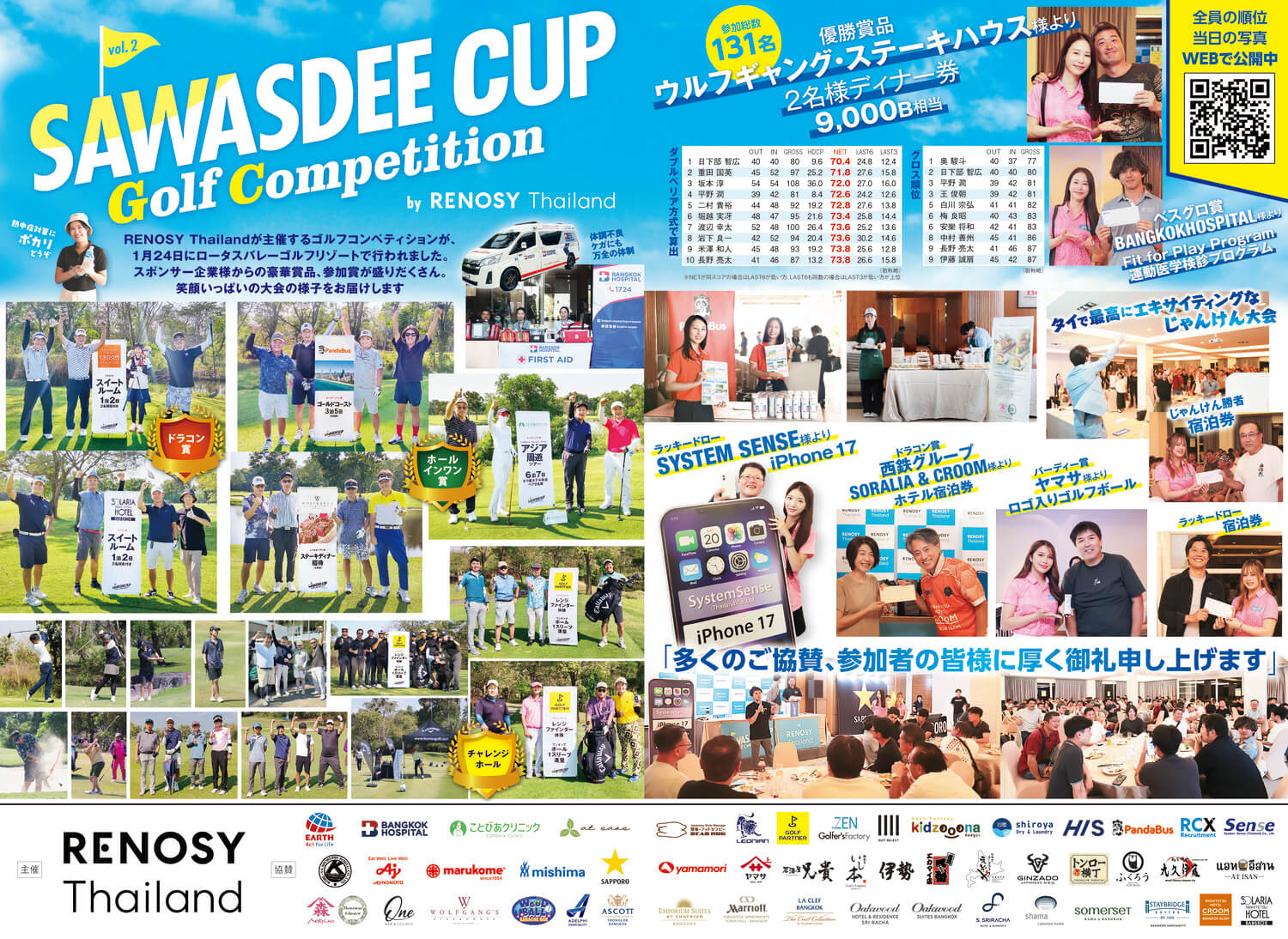 RENOSY Thailandが主催する「SAWASDEE CUP Golf Competition by RENOSY Thailand Vol.2」の結果発表ページです。第2回のゴルフコンペティションが1月24日にロータスバレーゴルフリゾートで行われました。各種順位と当日の写真をご覧頂けます。