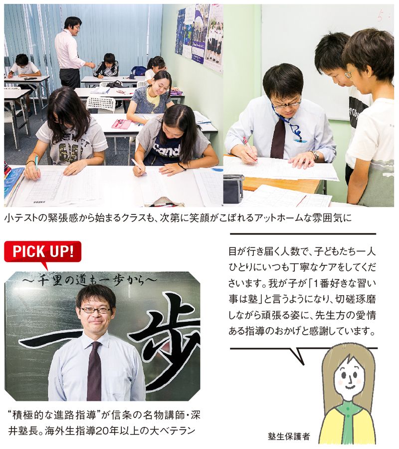 週に3日の中学受験コースは、1クラス5名までの少人数制。難関私立はもちろん、都市部で増えつつある公立中高一貫校の受験対策にも取り組む。受験科目は4教科でも、国語試験には社会性のあるテーマ、算数には理科の要素も含まれるなど、学校学習の内容以上の学力が求められる。「多分野に興味を持てることが基本です。分かりやすく楽しい授業を糸口に、子どもの興味を引き出し、反復練習や小テストなどで学力向上を目指します」(深井塾長)。毎日の宿題で自学自習の定着を図り、チェックと声掛けは欠かさない。実践内容には厳しさもあるが、授業を見学すると同校での“学び=楽しい”は一目瞭然。真剣に問題に取り組む姿勢と、弾けるような笑顔が見受けられた。