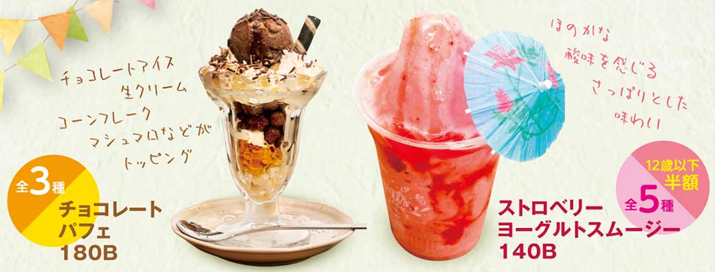 まずは、まろやかでコクのある豚骨醤油スープが絶品の「和歌山ラーメン」。濃厚スープと麺が絡みスルスルと食べられる。ボリューム満点の「生姜焼き」と「鶏テキ」はぜひとも食べておきたい一品。低温調理で仕上げた柔らかいお肉は肉厚ジューシーで美味。デザートにはタピオカ入りのフルーツスムージー(全5種)と、昔なつかしいパフェ(全3種)をどうぞ。食後のデザートまで充実のラインナップで子どもにも喜ばれること間違いなし。