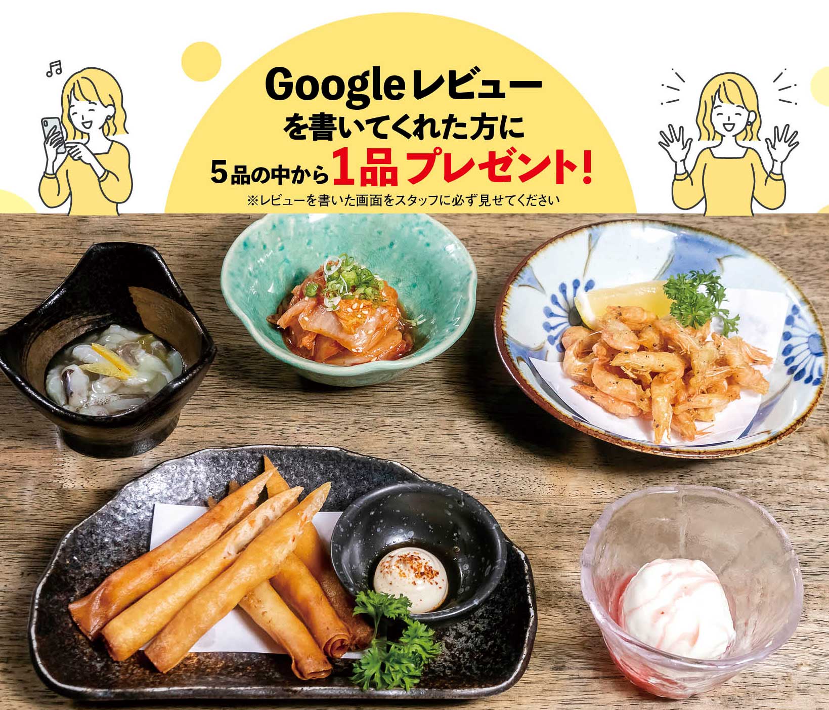 さらに6月からはグーグルレビューキャンペーンを開始。チキンケイのグーグルマップにレビューを書いてくれた方にはタコ山葵、海老と豚の細春巻き、自家製キムチ、小エビ唐揚げ、アイスクリームのうち1品をプレゼント。