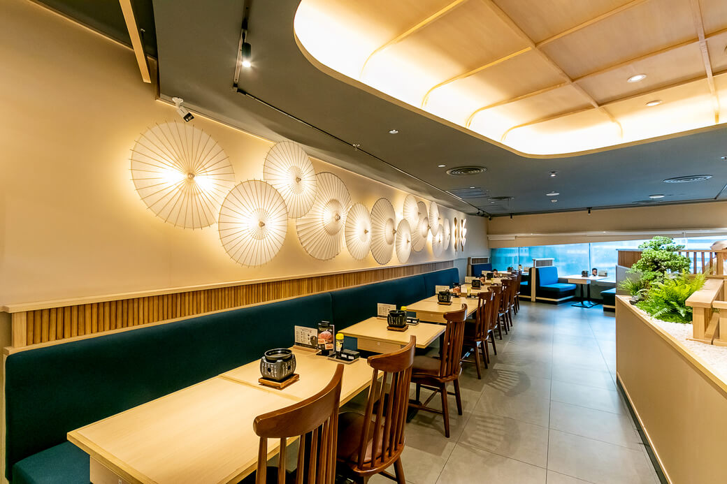 写真はエムクオーティエ店(6階・Helix Sky Dining)。温かみの感じる店内はひとり利用しやすい小さめのテーブル席から大人数用の席を完備。通し営業なので遅めのランチとしても便利