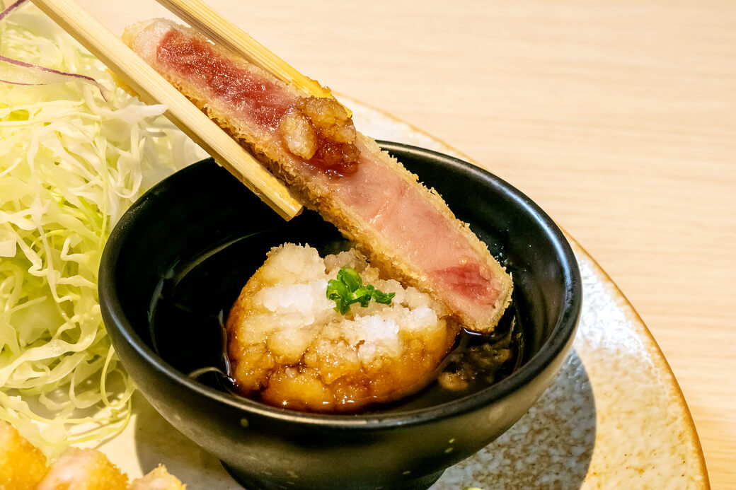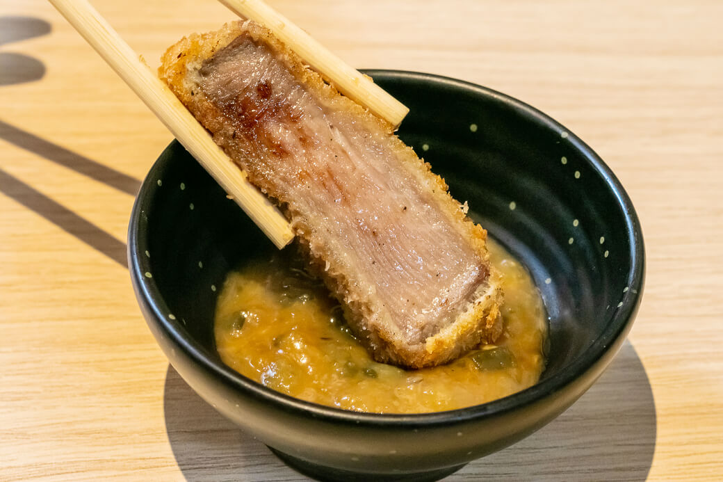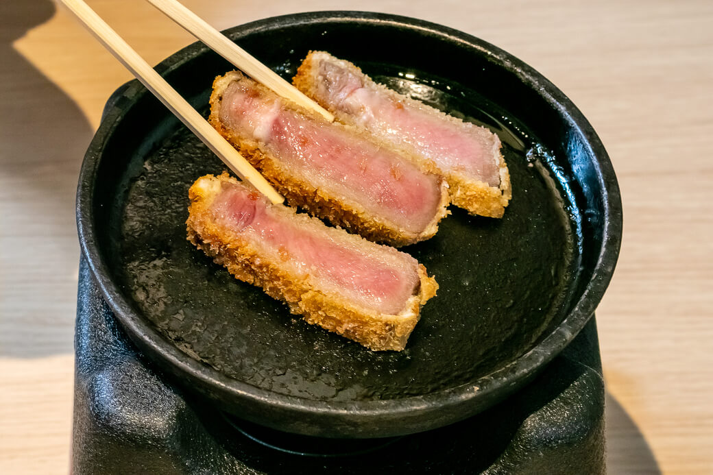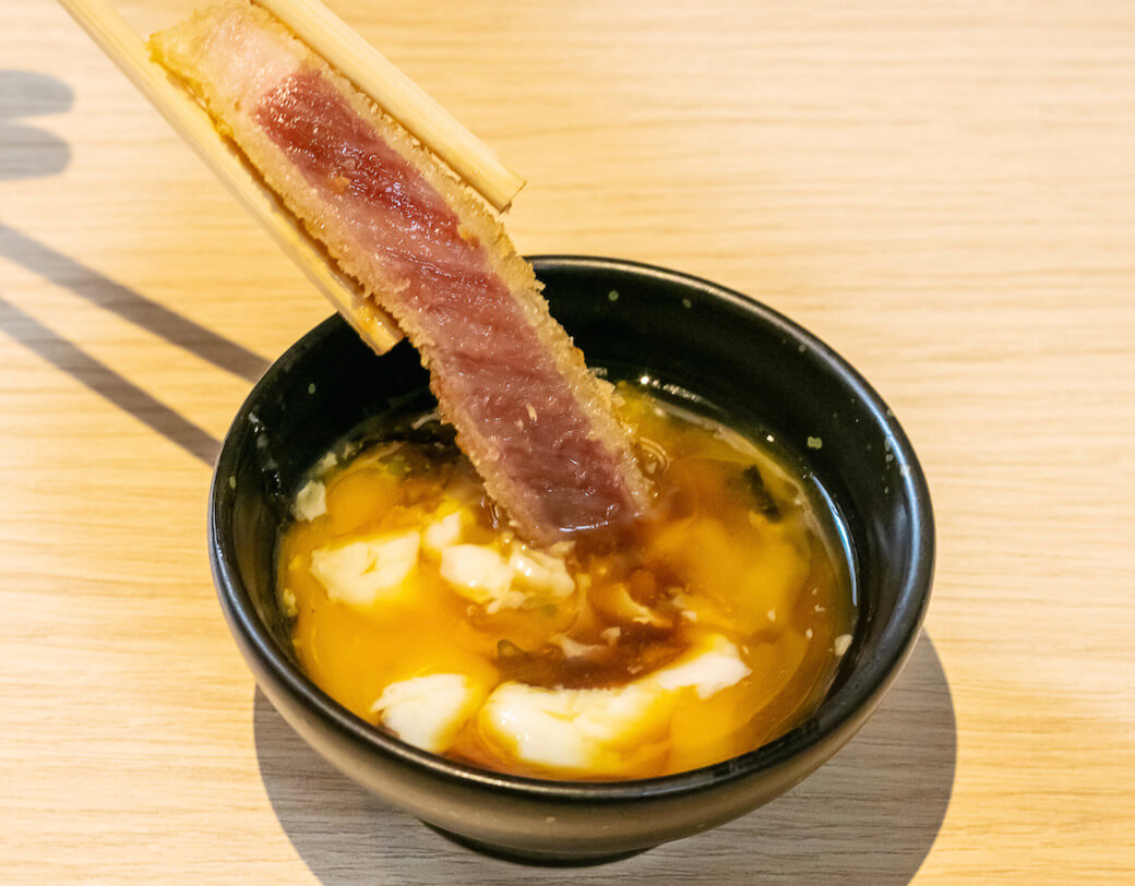 牛肉に含まれるタンパク質は、加熱することで65℃を境に旨味=肉汁へと変質する。火入れが甘いと肉汁を引き出しきれず、逆に火を通しすぎると肉汁を逃してしまう。勝牛では油の温度は180〜200度、揚げる時間は60〜120秒の高温短時間にこだわり、絶妙な火入れを実現している。