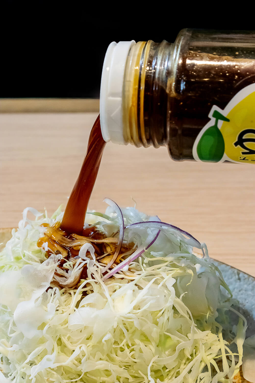 キャベツには勝牛オリジナルのゆずドレッシングをかけて。さっぱりとしたゆずの味わいで口の中がさわやかに
