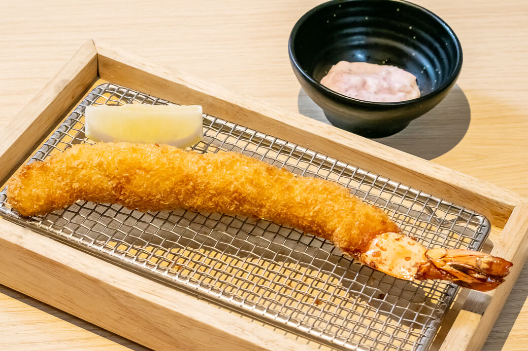 大ぶりの車海老を使用。さっくりと揚がった海老はぷりっぷりの食感。特製の京しば漬けタルタルを付けていただく