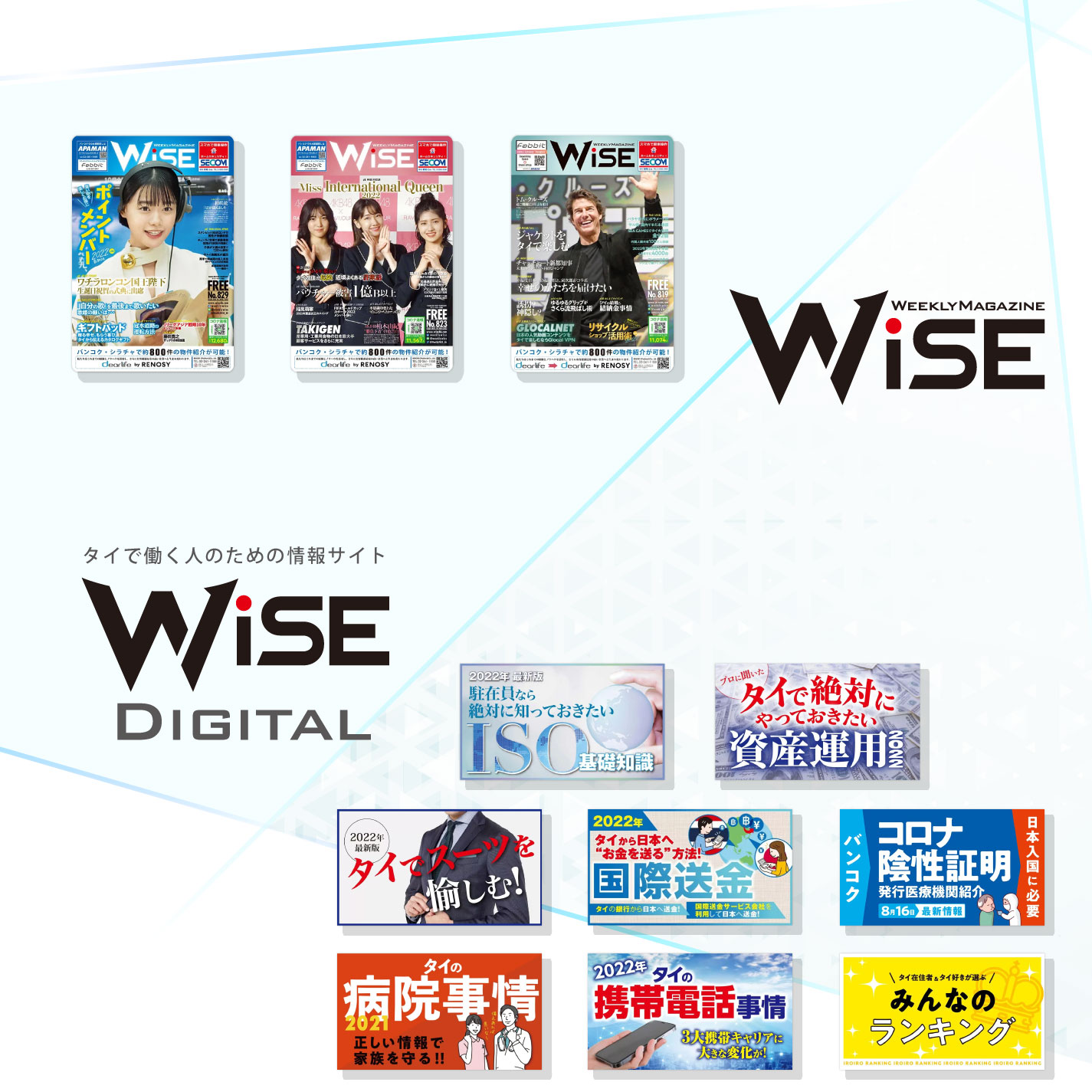 「WEEKLY WiSE (WiSE รายสัปดาห์)」เป็นนิตยสารแจกฟรีสำหรับชาวญี่ปุ่นในไทยเพียงเจ้าเดียวที่พิมพ์มาตลอดตั้งแต่ปี พ.ศ. 2546 เรามีกลุ่มเป้าหมายเป็นชาวญี่ปุ่น 80000 คนที่อาศัยอยู่ในประเทศไทย โดยเป็นแหล่งข้อมูลข่าวสารในไทยให้กับผู้อ่านชาวญี่ปุ่นเสมอมา