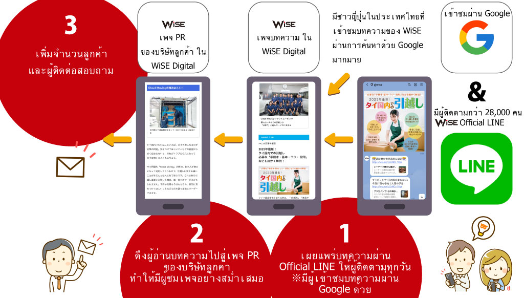 เราเผยแพร่ข่าวสารและบทความที่มีประโยชน์ในไทยทุกวันผ่าน Official LINE ของ WiSE (ผู้ติดตามกว่า 33,000 คน) ด้วยการแนะนำผู้ใช้ไปยังหน้าเว็บเพจ PR ของบริษัทท่านจากบทความที่เกี่ยวข้องกับบริการ จะทำให้เว็บเพจมีผู้เข้าชมอย่างอย่างสม่ำเสมอ ทั้งยังดึงดูดลูกค้าและทำให้ลูกค้าสอบถามข้อมูลเพิ่มขึ้นด้วย ※บทความที่เป็นประโยชน์ของ WiSE อยู่อันดับสูงในการค้นหาผ่าน Google ทำให้คาดได้ว่าจะมีลูกค้าที่สนใจบริการของท่านหลั่งไหลเข้ามา!