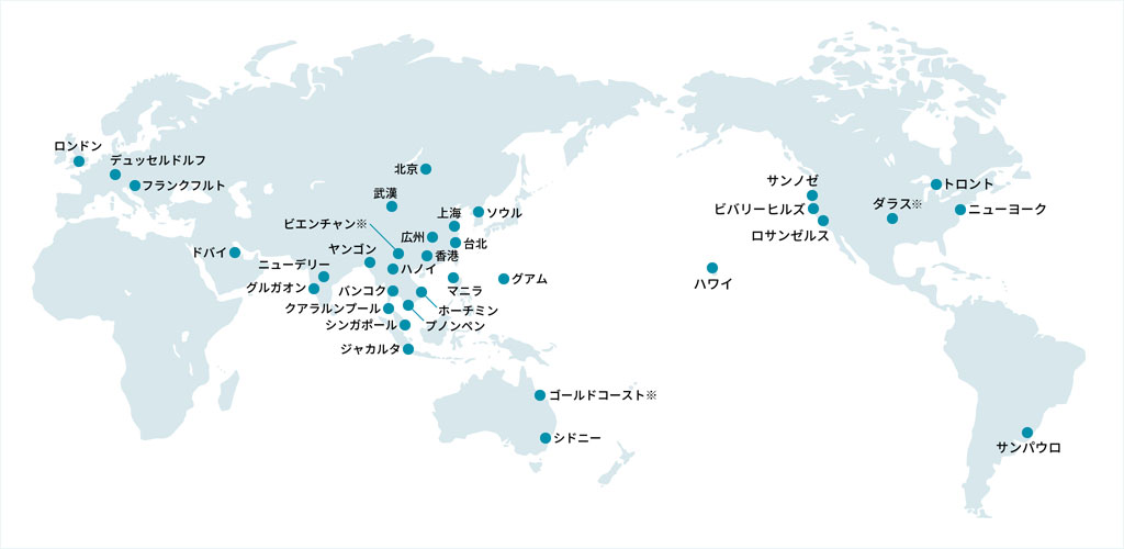 เราได้เริ่มขยายธุรกิจไปยังรัฐฮาวาย ประเทศสหรัฐอเมริกาในปี พ.ศ. 2529 ซึ่งปัจจุบันนี้เรามีเครือข่ายอยู่ใน 34 เมืองใน 21 ประเทศทั่วโลก (ข้อมูล ณ เดือนมกราคม พ.ศ. 2565) เพื่อสนับสนุนการขยายธุรกิจเชิงกลยุทธ์ในต่างประเทศให้แก่บริษัทญี่ปุ่นแต่ละประเภทและในขณะที่บริษัทญี่ปุ่นมากมายกำลังขยายธุรกิจเข้ามาในกรุงเทพฯ ในปี พ.ศ. 2548 เราจึงได้ก่อตั้งบริษัท Starts International Thailand ขึ้นเพื่อตอบสนองความต้องการที่หลากหลายได้อย่างยืดหยุ่น