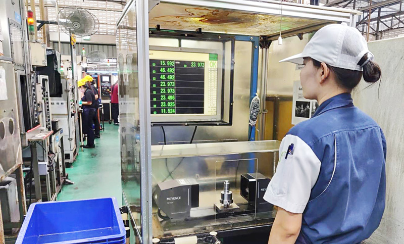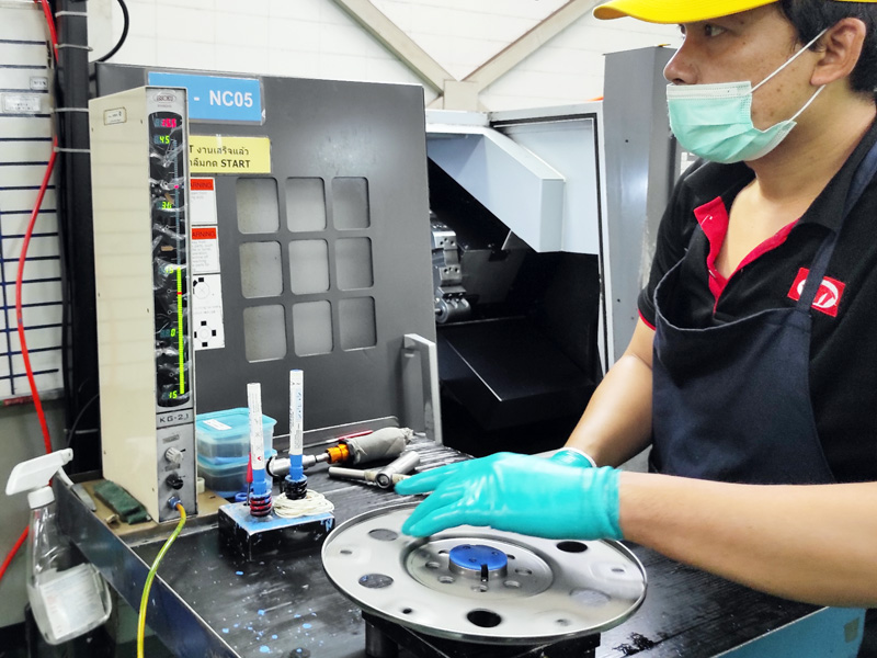 เราทำธุรกิจเกี่ยวกับการกลึงที่มีความแม่นยำสูงในฐานะบริษัทลูกของบริษัท THAI IKEDA MFG. หน้าที่ของเราคือการเพิ่มกระบวนการที่เรียกว่า “หลังการแปรรูป” ให้กับสินค้าที่ผลิตโดยบริษัท THAI IKEDA MFG. ไม่เพียงแต่การกลึงเท่านั้น แต่ยังทำหน้าที่ขจัดครีบเหล็กส่วนเกิน (ส่วนที่ยื่นออกมาจากขอบของสินค้า) การอบชุบด้วยคลื่นความถี่สูง และอื่น ๆ ซึ่งถือเป็นกระบวนการสุดท้ายที่สำคัญในการผลิตสินค้าให้สมบูรณ์แบบ