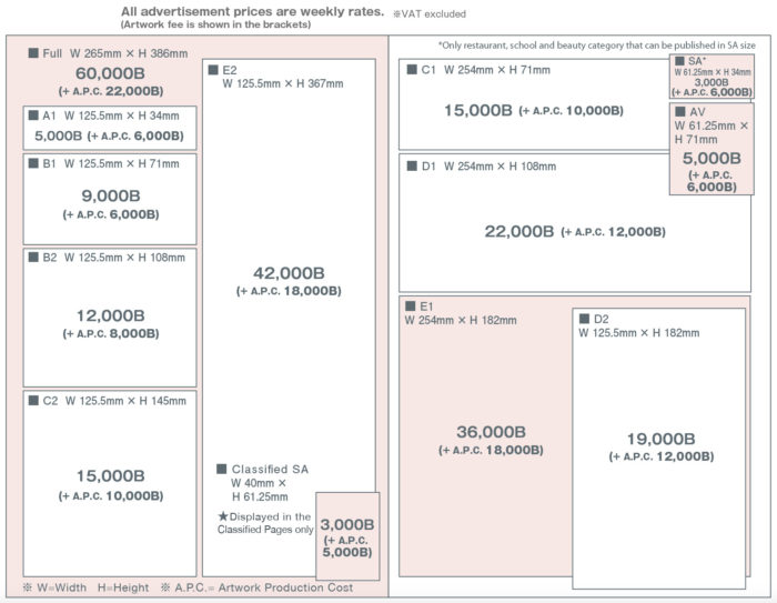 - หากต้องการสอบถามค่าโฆษณาบนหน้าปก หลังปก หรือโฆษณาบนปกด้านใน โปรดติดต่อพนักงานฝ่ายเซลล์ของเรา