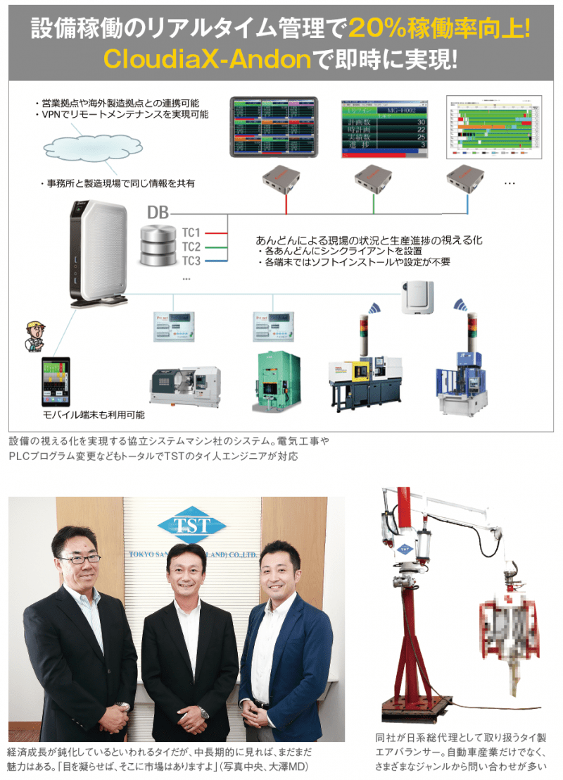創業65年を超える機械専門商社「東京産業」。自動車業界向け組立・加工設備、化学・食品プラント向け生産機器や環境設備など、さまざまな設備機器の国内外取引を展開し、顧客から“信頼”を勝ち得てきた。近年では、中国、東南アジア、メキシコでの取引を拡大。タイ進出は2011年と決して古くないが、顧客にとって“痒い所に手が届く”提案力で、確実に顧客を増やしつつある。強みの一端を担うのが人材力。新規案件の獲得率を上げ、また既存客が抱える課題を見つけて、解決策を提案する。そのためには、顧客の声を吸い上げ逃がさない、質の高い人材が必要だ。そのため、現地法人トップの大澤潤二郎マネージングダイレクター(以下MD)が「弊社のタイ人スタッフは、日本語に長けた女性です。製造現場に張り付き、専門用語が飛び交う現場で日々、顧客の悩みや要望を聞きに行っています」と話す通り、同社には一般の通訳とは一線を画す、極めて専門性の高い人材が揃う。「そういった『人財』を当社では、“スーパータイ人”と呼んでいます」(松浦雄馬マネージャー)戦略は見事に当たった。専門用語を的確に理解する上に、女性の気配りが奏功し、現場からの人気は上々だ。顧客が目指すのは、今や省人・省力化だが、人材不足や日々の業務多忙を理由に、着手できないでいる。だからこそ、現場を理解できるスーパータイ人が重宝される。さらなる基盤強化を図る同社(現法)は、日本人エンジニアの玉置哲朗チーフテクニカルオフィサーを増強。深い所での技術提案力も増してきている。まさに東京産業=人財力である。
