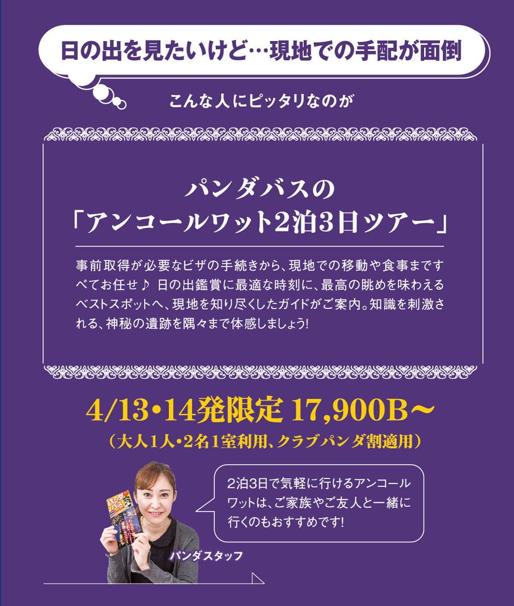 約400平方キロの広大な面積に、大小600の遺跡群が残される同遺跡。プロのガイドと回ることで、その歴史をより深く感じることができます。まずは日の出後に、アンコールワットの重要地点を観光。謎深き遺跡の歴史を知ることで、当時の風景が目の前に蘇ったかのような気分になれるはず。またアンコールワットはもちろん、バイヨンの四面像が有名なアンコールトム、果樹丸の樹が寺院に絡みついたタ・プロームといった人気の遺跡群も網羅。