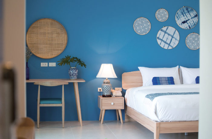 鮮やかな青色が目を引く各部屋では、インディゴ染めや水草の編み物、カゴ細工などタイ各地に根づく手仕事から生まれる工芸品がお出迎え。温かみ溢れる部屋に、心は完全にリラックスモード。100%自然由来のシャンプーやボディケアプロダクトを備え、身体を労わるのはもちろん環境への配慮も徹底しています。週末トリップにもおすすめです。帰る頃にはきっと、リフレッシュした自分に出会えるはず。