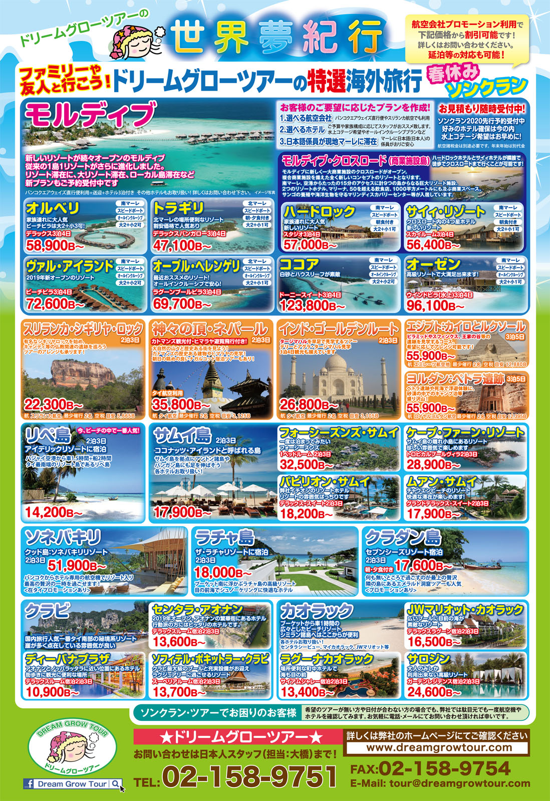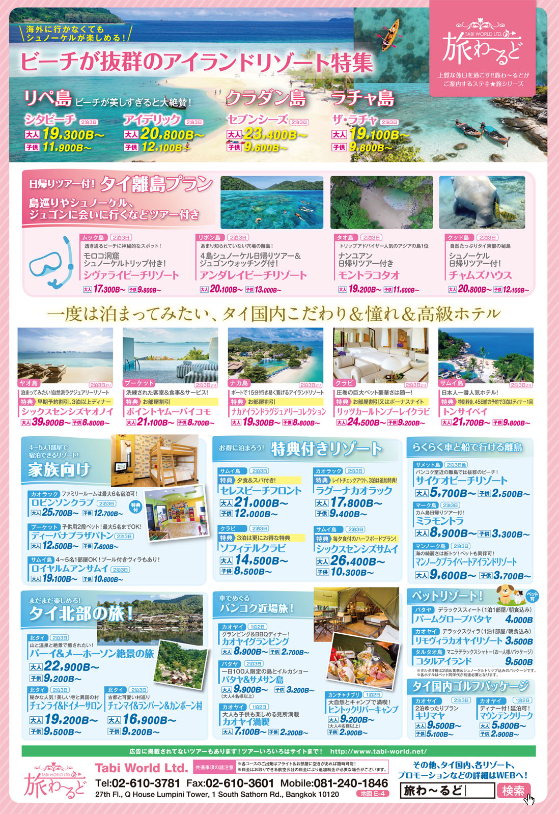 オールインクルーシブ 2泊3日 25,000B/人〜 ※3食付き(9つのレストランから選択可能)、ビール・ワイン・カクテル(一部) 飲み放題、サンセット&ドルフィンクルーズ、空港送迎ボートなどを含む。 |