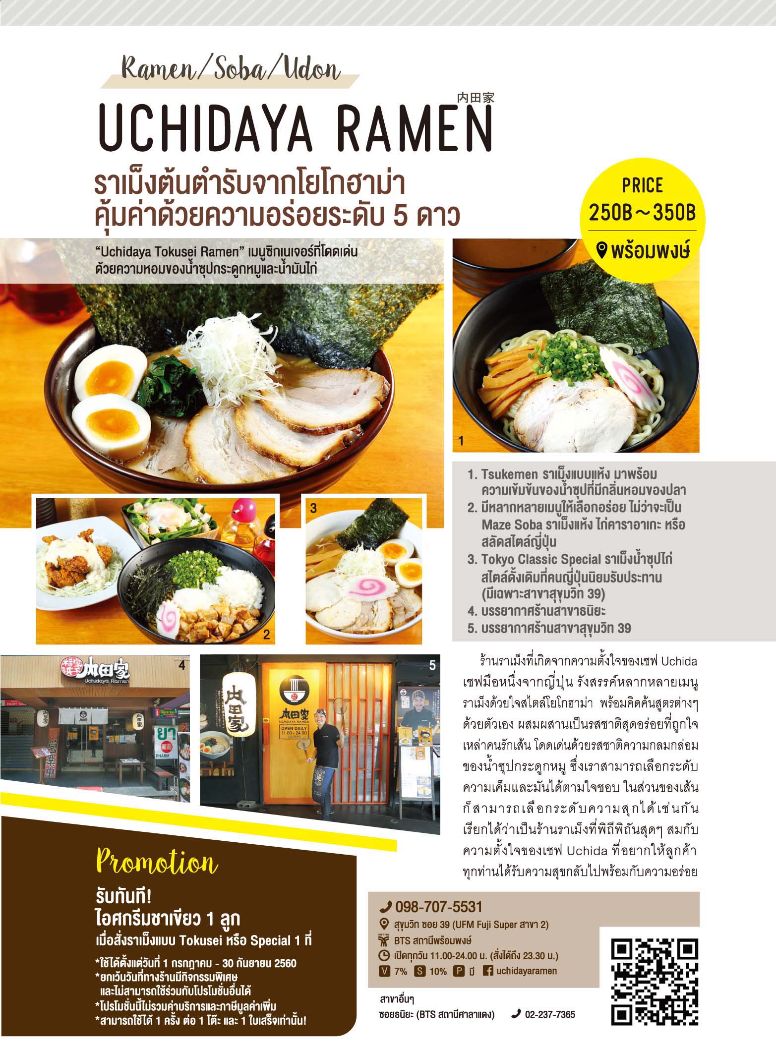 ร้านราเม็งที่เกิดจากความตั้งใจของเชฟ Uchida เชฟมือหนึ่งจากญี่ปุ่น รังสรรค์หลากหลายเมนูราเม็งด้วยใจสไตล์โยโกฮาม่า พร้อมคิดค้นสูตรต่างๆ ด้วยตัวเอง ผสมผสานเป็นรสชาติสุดอร่อยที่ถูกใจเหล่าคนรักเส้น โดดเด่นด้วยรสชาติความกลมกล่อมของน้ำซุปกระดูกหมู ซึ่งเราสามารถเลือกระดับความเค็มและมันได้ตามใจชอบ ในส่วนของเส้นก็สามารถเลือกระดับความสุกได้เช่นกัน เรียกได้ว่าเป็นร้านราเม็งที่พิถีพิถันสุดๆ สมกับ