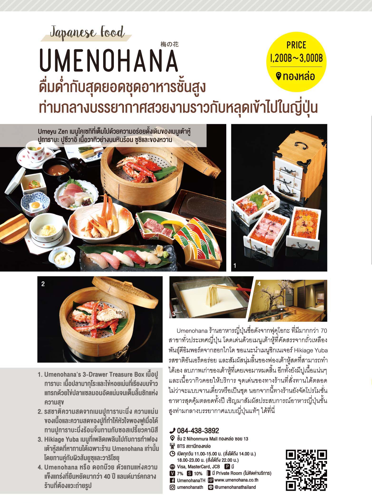 Umenohana ร้านอาหารญี่ปุ่นชื่อดังจากฟุคุโอกะ ที่มีมากกว่า 70 สาขาทั่วประเทศญี่ปุ่น โดดเด่นด้วยเมนูเต้าหู้ที่คัดสรรจากถั่วเหลืองพันธุ์ดีอิมพอร์ตจากฮอกไกโด ขอแนะนำเมนูซิกเนเจอร์ Hikiage Yuba รสชาติอันเอร็ดอร่อย และสัมผัสนุ่มลิ้นของฟองเต้าหู้สดที่สามารถทำได้เอง ลบภาพเก่าของเต้าหู้ที่เคยเจอมาหมดสิ้น อีกทั้งยังมีปูเนื้อแน่นๆ และเนื้อวากิวคอยให้บริการ จุดเด่นของทางร้านที่สั่งทานได้ตลอด ไม่ว่าจะแบบจานเดี่ยวหรือเป็นชุด นอกจากนี้ทางร้านยังจัดโปรโมชั่น อาหารสุดคุ้มตลอดทั้งปี เชิญมาสัมผัสประสบการณ์อาหารญี่ปุ่นชั้นสูงท่ามกลางบรรยากาศแบบญี่ปุ่นแท้ๆ ได้ที่นี่
