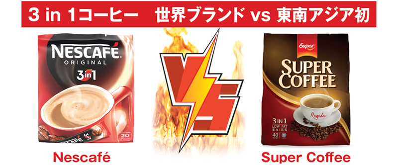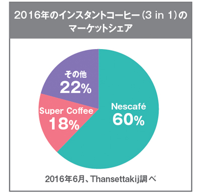 タイのコーヒーマーケットの2016年総売上は約200億バーツ。1人当たりの1年間のコーヒー消費量は、日本が約400杯に対し、タイは約200杯という調査結果も出ており、今後も成長が期待できるマーケットと言われています。その中で最も売上が高いのは「3 in 1」という、1袋にコーヒー・砂糖・ミルクが入っているインスタントコーヒーの分野で、約150億バーツの売上を占めています。 同市場の中で6割のシェアを占め、圧倒的1位となっているのが、世界的大手メーカー「Nescafé」。カフェやコーヒーメーカー機器を発売するなど、関連事業も展開しています。昨年はサンプル商品400万杯の無料提供キャンペーンを実施しました。 一方、2位はシンガポール生まれの「Super Coffee」。東南アジアで初めて3 in 1コーヒーを発売した会社で、18%のシェアを持っています。今後は新商品の開発のほか、中国への進出計画もあるとのこと。当面は、市場のシェア2割をキープすることを目標にしています。