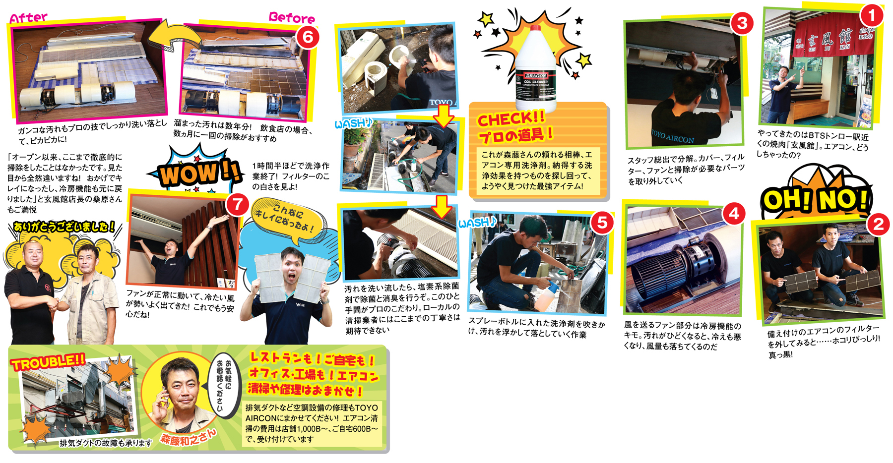 年中暑い南国タイのレストランでは、エアコンは必須。でも「あまり冷えない、水漏れがする、異音がする、変なにおいがする」なんてことが店内で起きたら、せっかくの食事の楽しさも半減しちゃうってもの……。そんなエアコンのトラブルを引き受け、清掃サービスを行っているのが「TOYO AIRCON」。代表の森藤さんは、この道10年以上のベテラン。