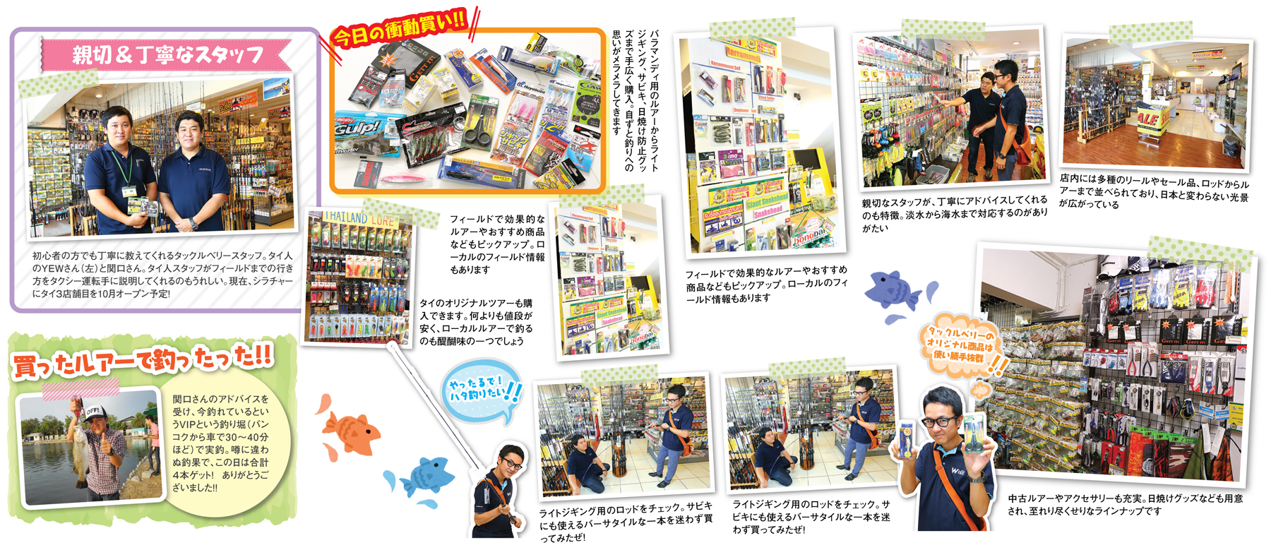 今回は、バラマンディ(バス釣りと似ています)と海用のタックルを購入すべく、日本人の釣り好きにはお馴染みのタックルベリーにやってきました。何よりもスタッフが丁寧にアドバイスしてくれるのがありがたいです。釣れているフィールドから効果的なルアー、細かい情報までかなり詳細に教えてもらえます。バラマンディはバンコクから車で1時間以内で行けるフィールドが多いため、手ぶらで同店まで来て、タックル購入後にそのまま向かうことも可能。