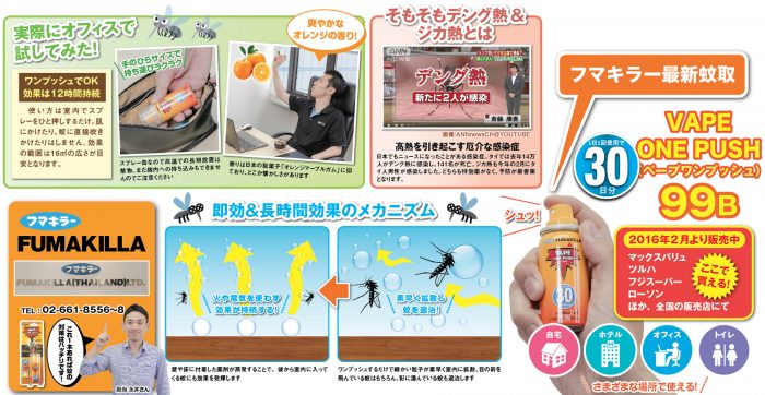 フマキラー「VAPE ONE PUSH(ベープワンプッシュ)」は2008年に日本で発売された「おすだけベープ」のタイ向けアイテム。2010年のインドネシア、2015年のベトナムに続いて、タイは3ヵ国目のリリースとなります。手軽なワンプッシュ式の蚊取スプレーでありながら殺虫効果が12時間も持続することが評判となり、各国で注目を浴びているヒット商品です。