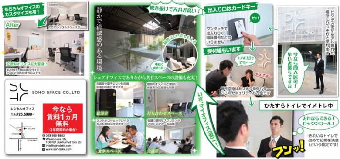 日本では聞き慣れたレンタルオフィスですが、タイにも同様のビジネスがあります。今回訪れたSOHOは、コンパクトでパーソナルなオフィスが確保でき、便利な共有スペースも完備。スタートアップに最適です。