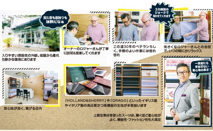 数多くのスーツのテイラーショップがあるバンコク。そのバンコクで唯一の本場イギリス式テイラーショップがあると聞き、ズームインしてきました。スーツ・テイラーといえば、重厚で入りづらいイメージでしたが、こちらはアットホームなリラックス空間。この道30年のオーナー、ロジャーさんが、日本語・タイ語・英語を交え、フランクかつ丁寧に対応してくれます。まずは、イギリスやイタリアから取り寄せた生地、数百点から、色や肌触りなどをチェックし、好みのものをセレクトしていきます。次に身体の各パーツを細かく採寸。接着剤を使って作られるスーツも多いですが、こちらのスーツはほとんどが手縫い。動きの多いアームホールなどは、ミシン縫いにはない動きやすさを実現しています。体型などにお悩みの方も、ロジャーさんが的確にアドバイス。上質でリーズナブルなスーツを手に入れるならぜひ!