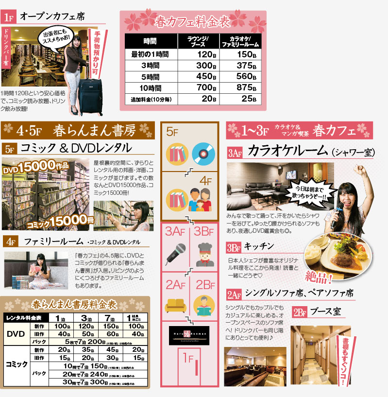 4万冊の蔵書や最新の日本の雑誌を揃えるマンガ喫茶。11月からコミック&DVDレンタルの「春らんまん書房」が4、5階に入居し、パワーアップリニューアルを遂げました! マンガが読みたいときだけでなく、在住者の集い、出張者のカフェ利用など、どんなシーンにも使える新空間です。