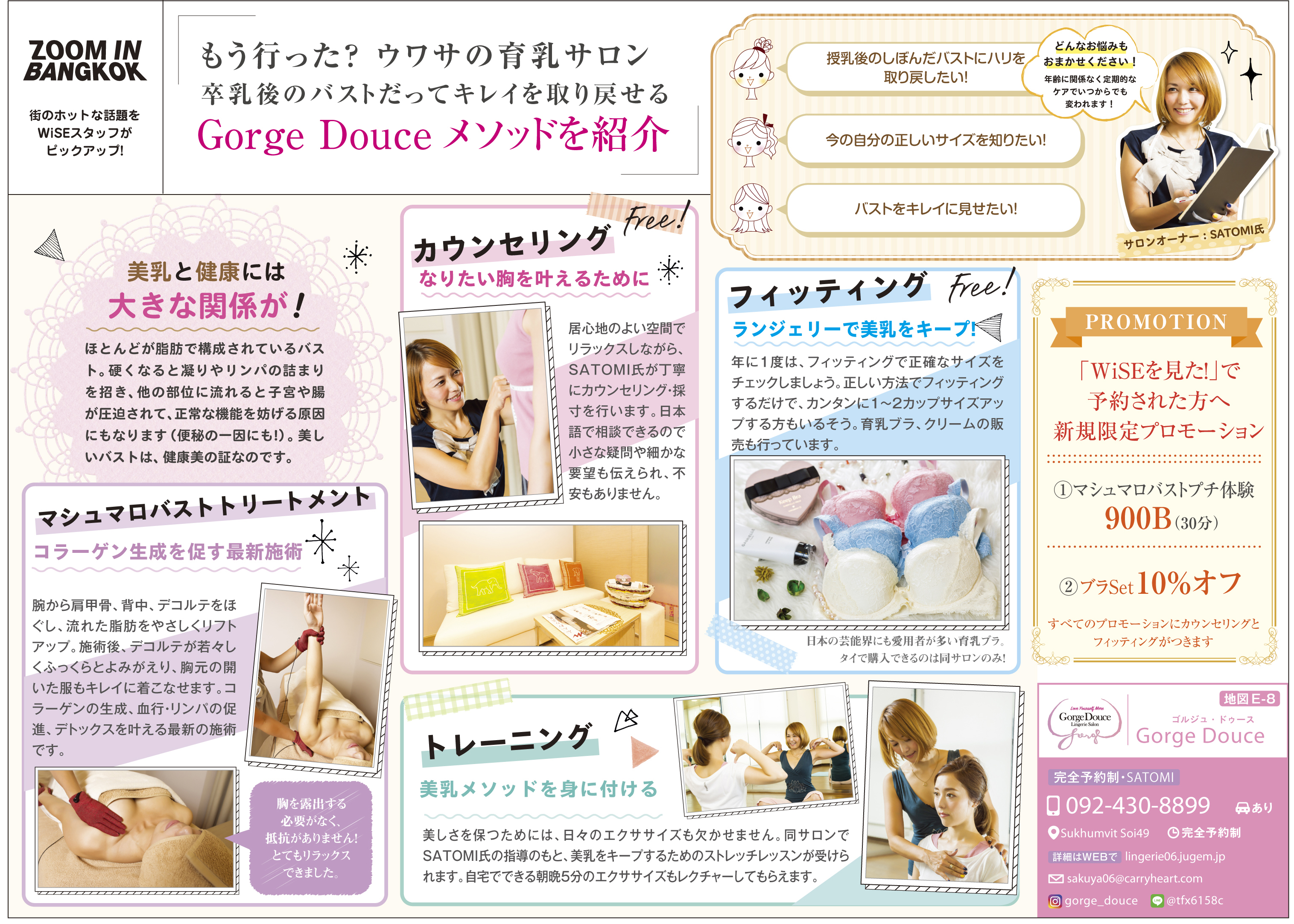2018.02.5 ZOOM in BANGKOK VOL.83 : Gorge Douce もう行った? ウワサの育乳サロン 卒乳後のバストだってキレイを取り戻せる 2018/1/31 現在の情報です。 この記事をSNSでシェア! Tweet Share LINE リンクをコピー