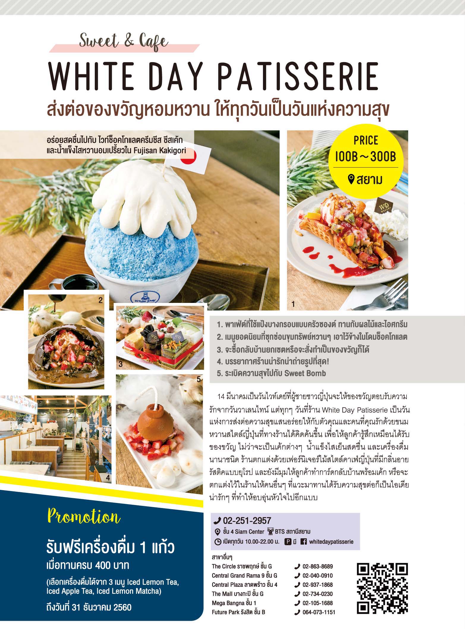 14 มีนาคมเป็นวันไวท์เดย์ที่ผู้ชายชาวญี่ปุ่นจะให้ของขวัญตอบรับความรักจากวันวาเลนไทน์ แต่ทุกๆ วันที่ร้าน White Day Patisserie เป็นวันแห่งการส่งต่อความสุขแสนอร่อยให้กับตัวคุณและคนที่คุณรักด้วยขนมหวานสไตล์ญี่ปุ่นที่ทางร้านได้คิดค้นขึ้น เพื่อให้ลูกค้ารู้สึกเหมือนได้รับของขวัญ ไม่ว่าจะเป็นเค้กต่างๆ น้ำแข็งไสเย็นสดชื่น และเครื่องดื่มนานาชนิด ร้านตกแต่งด้วยเฟอร์นิเจอร์ไม้สไตล์คาเฟ่ญี่ปุ่นที่มีกลิ่นอายรัสติคแบบยุโรป และยังมีมุมให้ลูกค้าทำการ์ดกลับบ้านพร้อมเค้ก หรือจะตกแต่งไว้ในร้านให้คนอื่นๆ ที่แวะมาทานได้รับความสุขต่อก็เป็นไอเดียน่ารักๆ ที่ทำให้อบอุ่นหัวใจไปอีกแบบ