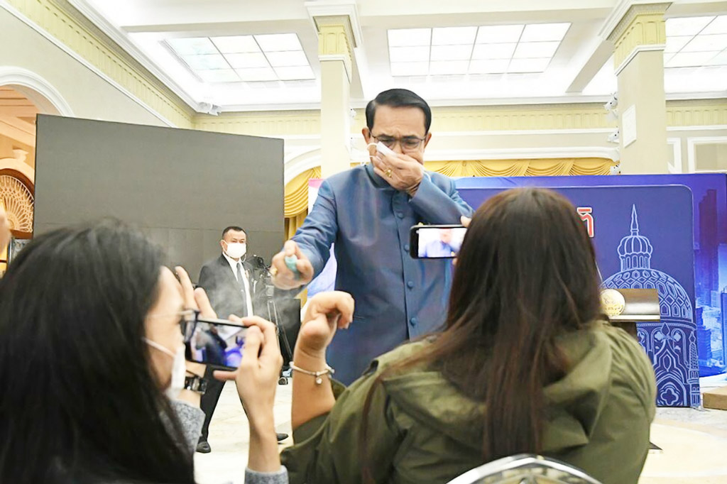 9日の閣議後、プラユット首相が記者団に向け除菌スプレーを噴射。後任の閣僚について聞かれると、「まだわからない、質問するな」と顔を歪めながら応酬した。