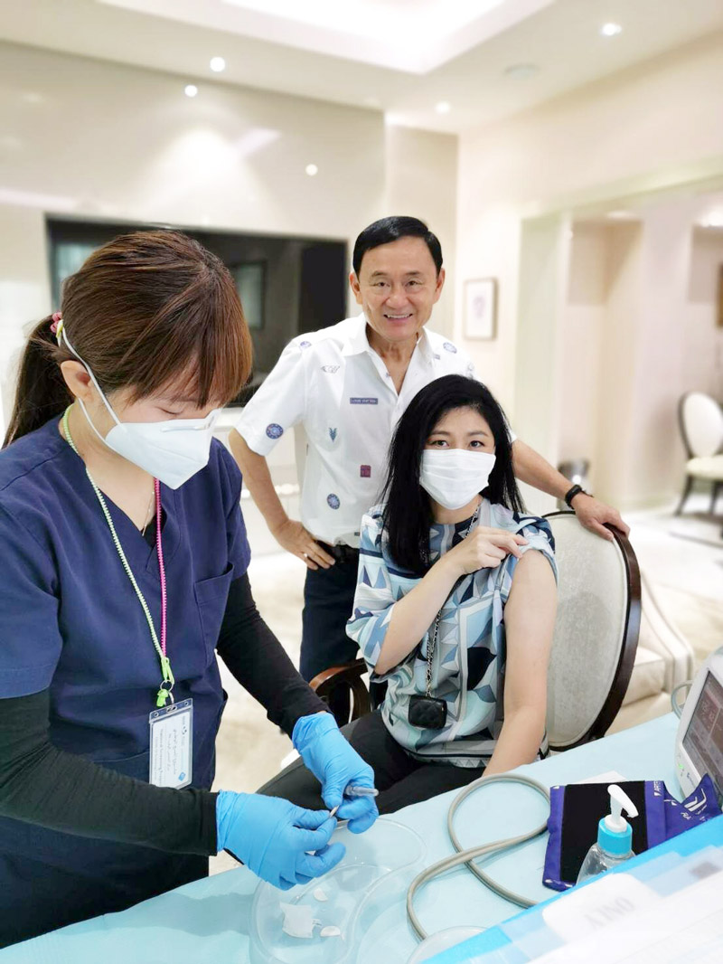 インラック前首相が2回目のワクチン接種の様子をインスタグラムに投稿。そばにはタクシン元首相の姿も写っていた。接種したワクチンは中国Sinopharm製。