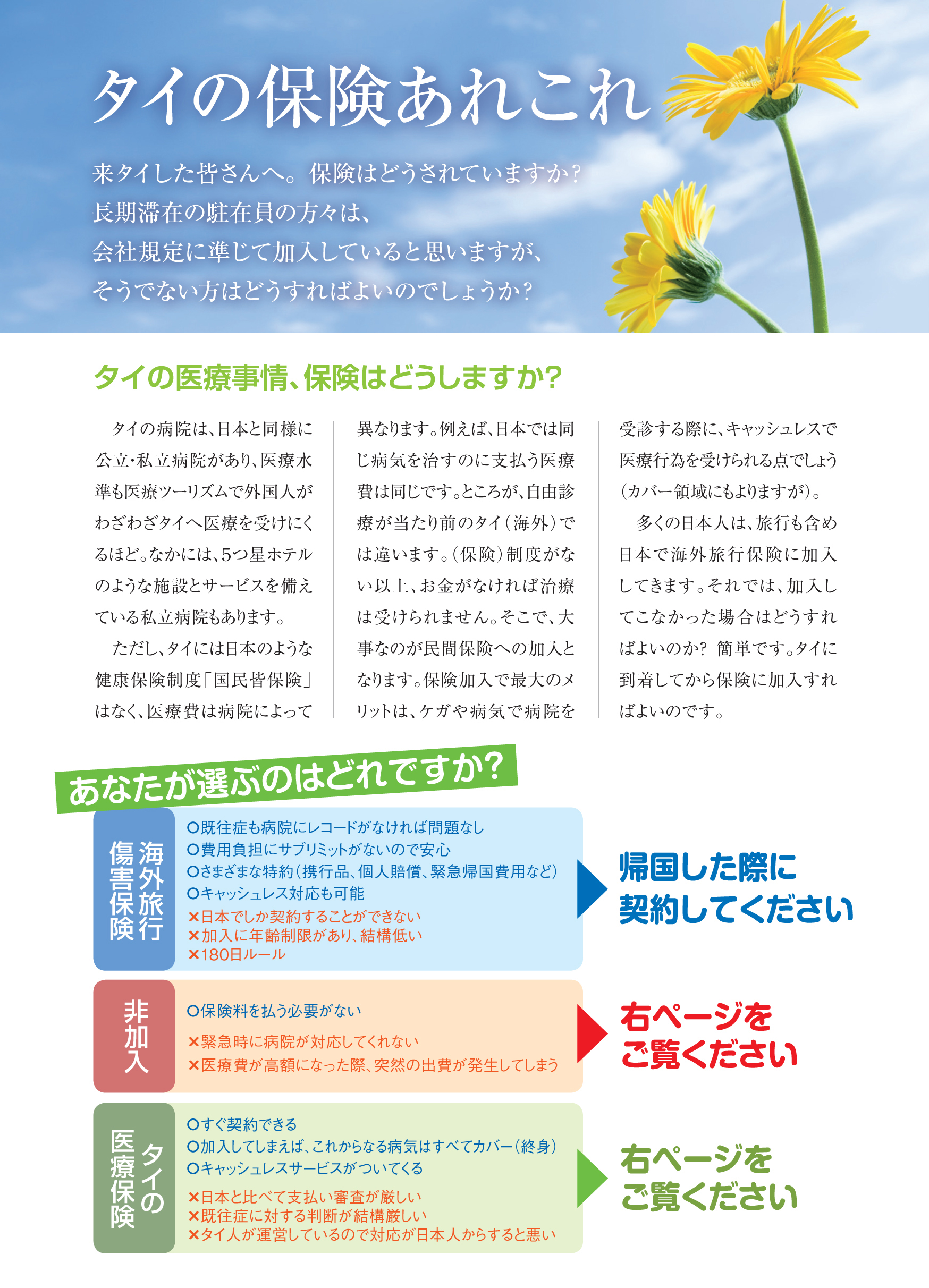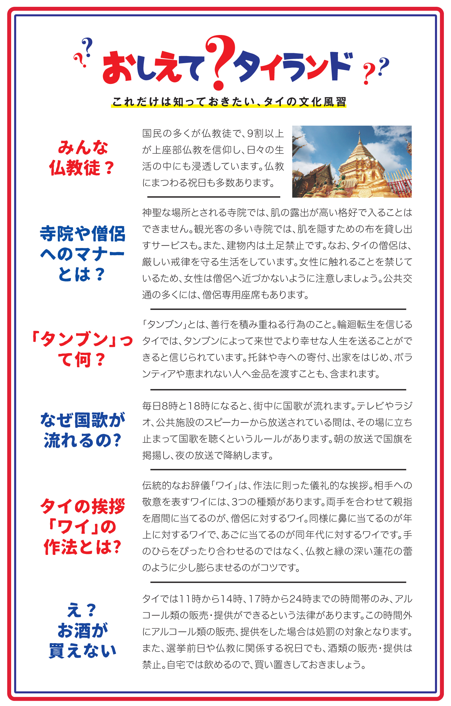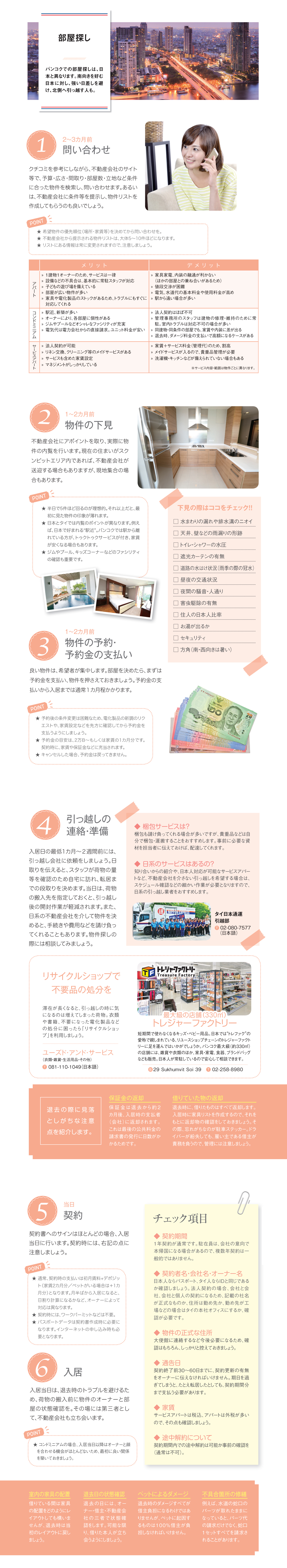 2018.05.1 その他 WiSE Family Bangkok 2018【1】 CONTENT INDEX 第1章 概要 タイの基礎知識 バンコク広域MAP シラチャMAP バンナーMAP パタヤMAP タイの1年 おしえてタイランド 第2章 交通 バンコクの路線図 BTS(高架鉄道) MRT 電車利用の注意 タクシー シーロー 路線バス スワンナプーム国際空港 ドンムアン国際空港 指差しガイド(移動編) タクシーなどで使える基本タイ語 第3章 生活 携帯電話 銀行 クレジットカード ビザ Q&A【お金編】 タイの保険あれこれ 郵便 Q&A【日常生活編】 Q&A【医療編】 第4章 住居 バンコクエリアガイド 部屋探し Q&A【アヤさん編】 ペットと暮らす 害虫対策 Q&A【住居編】 第5章 帰国 本帰国の準備 教育の準備 CLIENTS INDEX 学校 立命館慶祥 金融・保険 AEON バンコック銀行 ほけんの110ばん クリーニング 喜久屋 携帯電話 BERRY MOBILE 浄水器 CKMA ショッピング サイアムシティマート パリミキ 日用品 アース 引っ越し 日本通運 ヤマタネ 不動産会社 紅樹・HASCO すずき不動産 峯岸コーポレーション ペット トウィンクル ホテル THONGLOR PET HOSPITAL レンタカー 配車アプリ RYO&F GRAB VISA SABAIJAI CONSULTING タイで働く日本人に特化した スカウト転職サイト「タイスカウト」 サービス開始!(完全無料) 株式会社サンクアジアは5月2日、日タイ転職に特化したスカウト型の転職サイト「Thai Scout(タ… 「MITSUKOSHI DEPACHIKA」新年ギフトセット「GIFT FROM THE HEART」を発売 2026年の新春を彩る、日本スタイルのお歳暮・お年賀コレクション 「MITSUKOSHI DEPACHIKA」“心からの贈り物”という日本の贈る文化の精神を込めた新年… ことびあクリニック 夜22時まで対応可能なオンライン診療や お薬デリバリーも可能! DYMクリニック 2024-2025年用インフルエンザワクチンの取り扱い開始 タイでは1年を通してインフルエンザに感染する可能性があるため、ワクチンの接種が推奨されている。DYM… この記事をSNSでシェア! Tweet Share LINE リンクをコピー