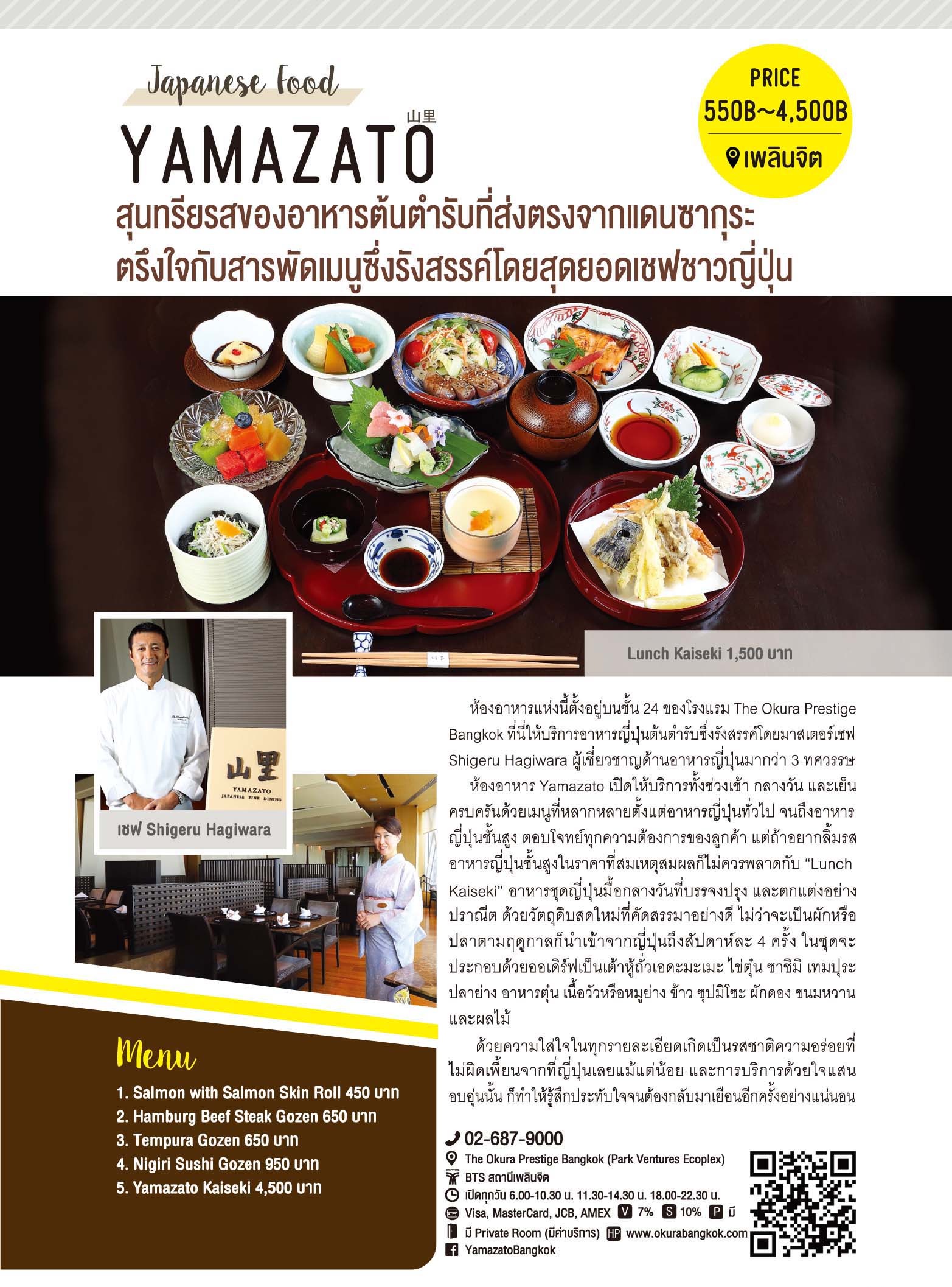 ห้องอาหารแห่งนี้ตั้งอยู่บนชั้น 24 ของโรงแรม The Okura Prestige Bangkok ที่นี่ให้บริการอาหารญี่ปุ่นต้นตำรับซึ่งรังสรรค์โดยมาสเตอร์เชฟ Shigeru Hagiwara ผู้เชี่ยวชาญด้านอาหารญี่ปุ่นมากว่า 3 ทศวรรษ ห้องอาหาร Yamazato เปิดให้บริการทั้งช่วงเช้า กลางวัน และเย็น ครบครันด้วยเมนูที่หลากหลายตั้งแต่อาหารญี่ปุ่นทั่วไป จนถึงอาหารญี่ปุ่นชั้นสูง ตอบโจทย์ทุกความต้องการของลูกค้า แต่ถ้าอยากลิ้มรสอาหารญี่ปุ่นชั้นสูงในราคาที่สมเหตุสมผลก็ไม่ควรพลาดกับ “Lunch Kaiseki” อาหารชุดญี่ปุ่นมื้อกลางวันที่บรรจงปรุง และตกแต่งอย่างปราณีต ด้วยวัตถุดิบสดใหม่ที่คัดสรรมาอย่างดี ไม่ว่าจะเป็นผักหรือปลาตามฤดูกาลก็นำเข้าจากญี่ปุ่นถึงสัปดาห์ละ 4 ครั้ง ในชุดจะประกอบด้วยออเดิร์ฟเป็นเต้าหู้ถั่วเอดะมะเมะ ไข่ตุ๋น ซาชิมิ เทมปุระ ปลาย่าง อาหารตุ๋น เนื้อวัวหรือหมูย่าง ข้าว ซุปมิโซะ ผักดอง ขนมหวาน และผลไม้ ด้วยความใส่ใจในทุกรายละเอียดเกิดเป็นรสชาติความอร่อยที่ไม่ผิดเพี้ยนจากที่ญี่ปุ่นเลยแม้แต่น้อย และการบริการด้วยใจแสนอบอุ่นนั้น ก็ทำให้รู้สึกประทับใจจนต้องกลับมาเยือนอีกครั้งอย่างแน่นอน