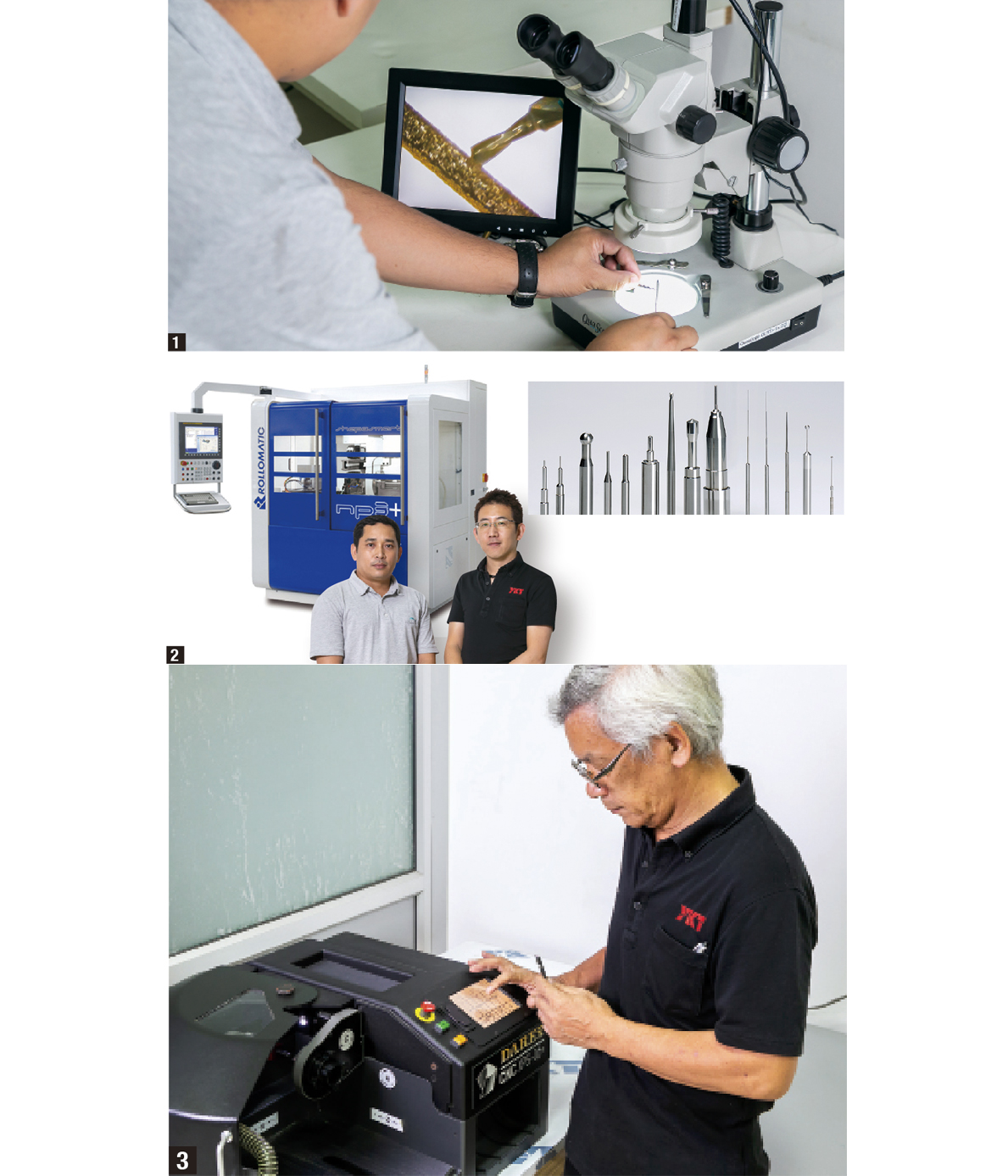 タイ進出3年目を迎えた同社では、修理やメンテナンスなどの技術サービスを主軸で行う一方、使い古した機械を新品同様に蘇らせるオーバーホールの実績を着実に蓄積。部品単位での点検や交換を実施することにより、“機械の延命”に成功している。YKT本社で技術部長を務めた経験を持つ下山眞人テクニカルマネージャーを筆頭とする技術者をはじめ、切断機や砥石型機、研削盤、レーザー加工機、精密ろ過機、投影機、工具測定顕微鏡、磨き装置、コーティング炉といった工具周りの設備を網羅する同社だからこそ成せる業。“トータルソリューション”をキーワードに、日々、企業の問題解決にあたる。